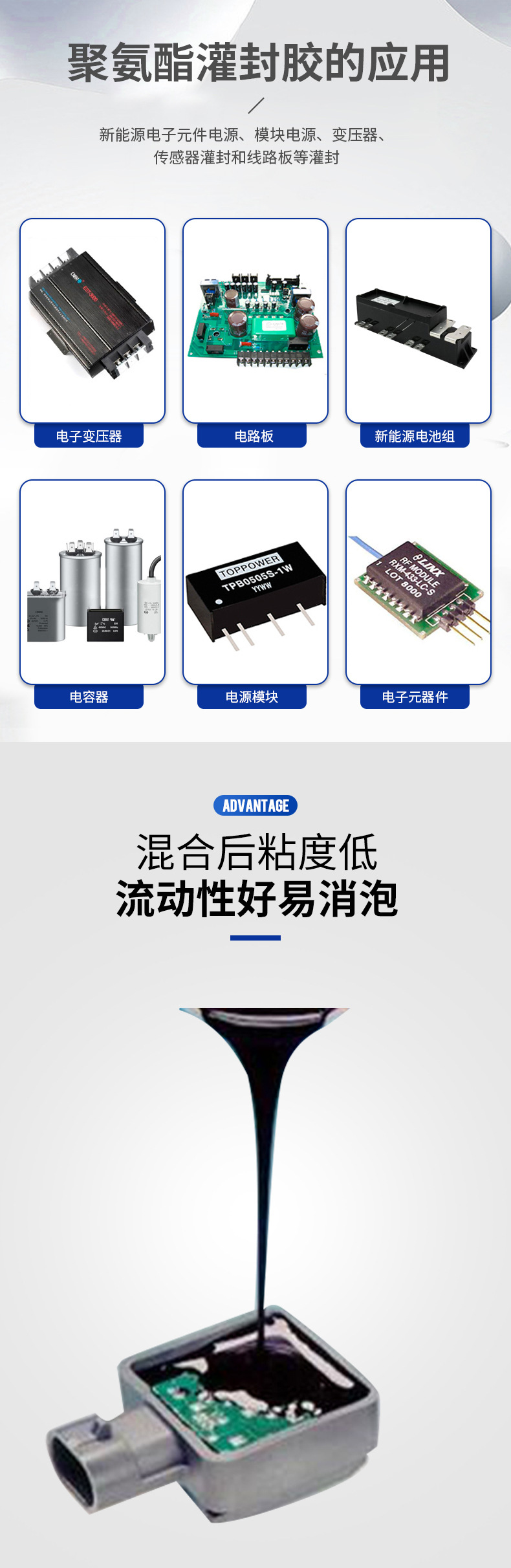 ● 廣泛應(yīng)用于變壓器、電器,AC電容、高壓包、負(fù)離子發(fā)生器、水族水泵、點(diǎn)火線圈、電源模塊、電子控制器及其它電子元器件的灌封;